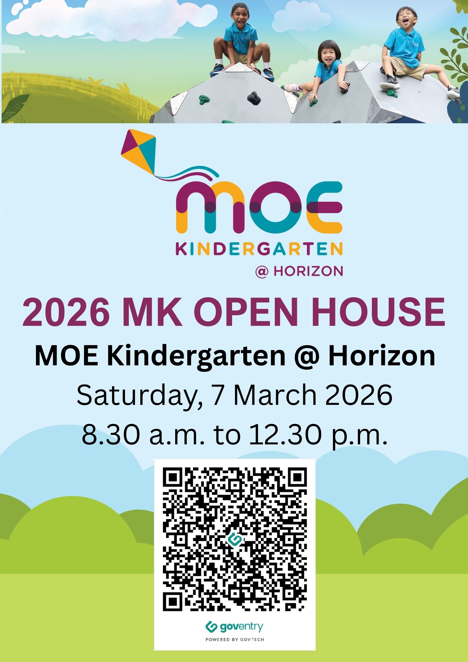 We would like to warmly welcome you to the 2026 MOE Kindergarten Open House at MK@Horizon located within our primary school’s premises, on Saturday, 7 March 2026 from 8.30 a.m. to 12.30 p.m. (last walk-in at 12.15 p.m.). During the Open House, you can tour the learning environment, and speak to our MK educators to find out why MK is the choice for quality preschool and why our children love MK.